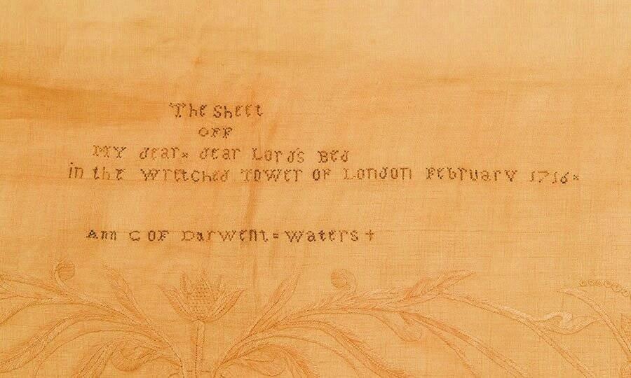 Bảo tàng London trưng bày tấm vải với ghi ghú về nội dung của tấm vải, nội dung: “Tấm ga trải giường của Lord’s thân yêu của tôi trong Tháp London khốn khổ tháng 2 năm 1716 x Ann C of Darwent = Waters”.