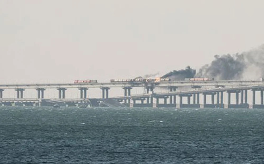 Cầu Kerch bốc cháy dữ dội sau vụ nổ hôm 8-10 Ảnh: REUTERS