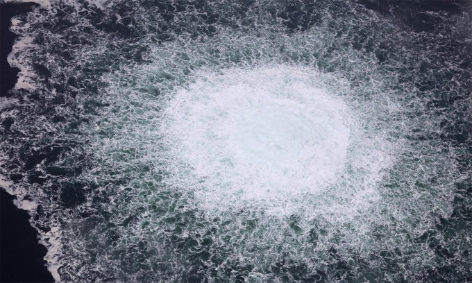 Bong bóng khí rò rỉ từ đường ống Nord Stream 1 nổi lên bề mặt biển Baltic ngày 28/9. Ảnh: Cảnh sát biển Thụy Điển.