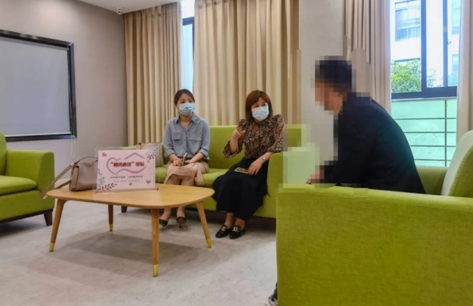 Gu Xiaoqing (giữa) và Wang Dongli (trái) trong buổi tư vấn với một nam giới bạo hành. Ảnh: Wang Dongli