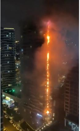 Video được chia sẻ trên mạng xã hội cho thấy cột lửa dọc theo cạnh bên của tòa nhà, có thể là nơi có cầu thang bộ hoặc trục thang máy.