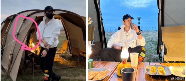 Một nhóm khán giả đi du lịch cũng bắt gặp Huỳnh Hiểu Minh và chụp hình nam diễn viên. Trong loạt hình, tài tử diện trang phục chỉn chu, ngồi trong lều, xung quanh là bàn tiệc dã ngoại được sắp đặt rất tinh tế, khéo léo với hoa, nến, bánh ngọt...