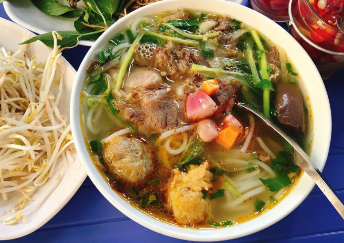 Bún bò ăn kèm rau sống, giá đỗ. Nếu thích ăn rau chín, bạn có thể yêu cầu chủ quán trần rau sống giúp trước. Ảnh: Ngọc Trân