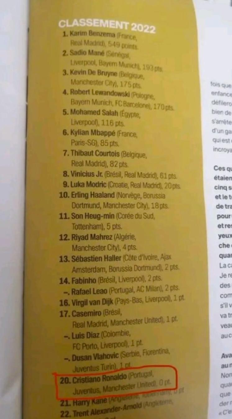Việc không nhận được phiếu bầu nào và chỉ xếp thứ 20 là vị trí thấp nhất mà Ronaldo phải nhận kể từ năm 2005 - khi anh không được đề cử.Đồng đội cũ của CR7 tại Real Madrid là Karim Benzema lần đầu tiên trong sự nghiệp giành được danh hiệu Quả bóng Vàng. Tiền đạo người Pháp nhận được 549 phiếu bầu, hơn 300 phiếu so với người đứng thứ hai là Sadio Mane với 193 phiếu.