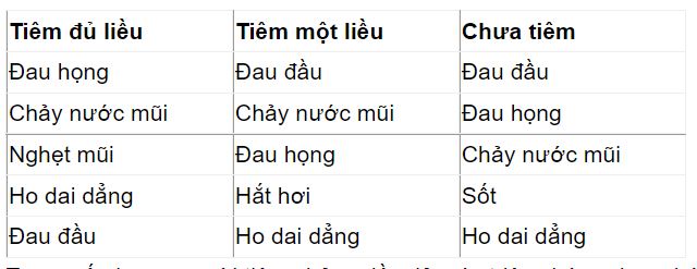 Theo đó, các nhà nghiên cứu đã phát hiện rằng đối với những người tham gia khảo sát ở cả ba nhóm (tiêm đầy đủ, tiêm một liều và chưa tiêm), 4 trong số 5 triệu chứng phổ biến nhất đều giống nhau, gồm: đau họng, chảy nước mũi, ho dai dẳng và đau đầu.