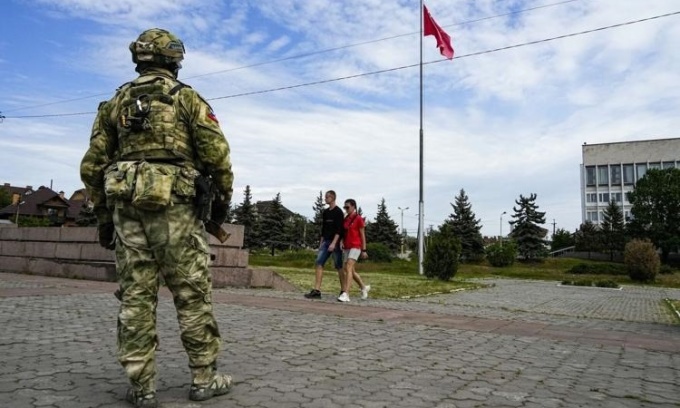 Binh sĩ Nga đứng gác tại một địa điểm ở thành phố Kherson, tỉnh Kherson, miền nam Ukraine, ngày 20/5. Ảnh: AP.