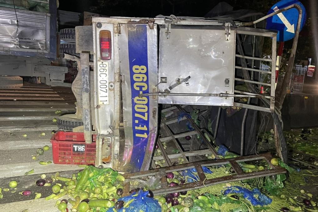 Xe chở rau lật sau tai nạn, sáng 26/10. Ảnh: Tư Huynh
