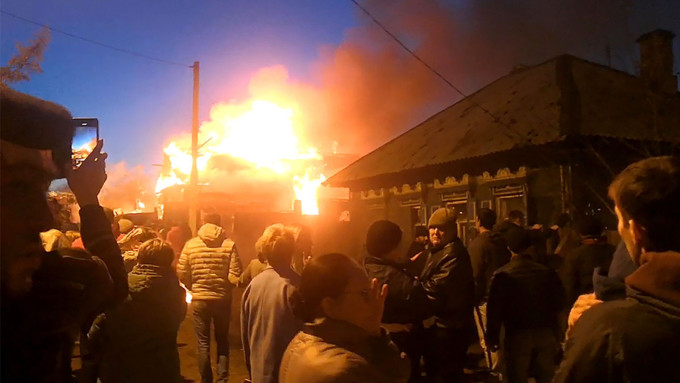 Đám cháy bùng lên sau khi tiêm kích Su-30 lao xuống nhà dân ở Irkutsk. Ảnh: TASS.
