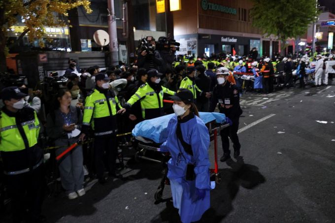 Nhân viên cứu hộ di chuyển thi thể nạn nhân khỏi hiện trường vụ giẫm đạp ở Itaewon, thủ đô Seoul, Hàn Quốc hôm 29/10. Ảnh: Reuters.
