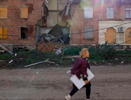 Một phụ nữ đi qua tòa nhà bị trúng tên lửa ở Bakhmut, Ukraine. (Ảnh: Reuters)