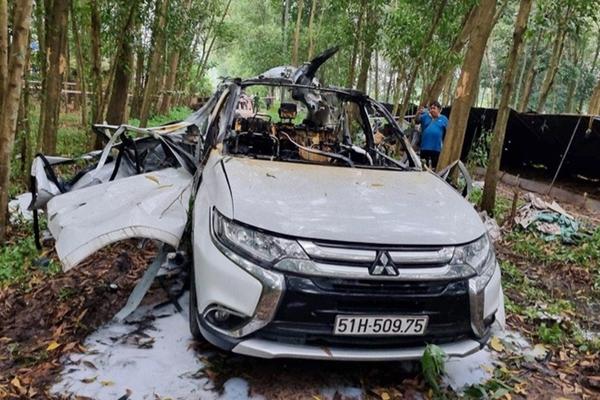 Tại hiện trường, ôtô bị biến dạng, khung cửa, thân xe móp méo, kính chắn gió, cửa sổ vỡ tung, các hàng ghế cháy rụi. Nhiều mảnh vỡ văng xa hàng chục mét dưới đất và vướng trên cành cây.