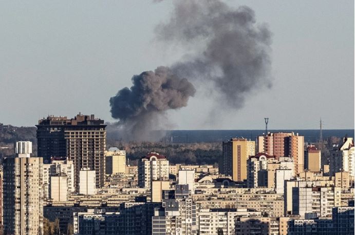 Khói bốc lên ở ngoại ô thành phố Kiev sau cuộc tấn công của Nga. Ảnh: Reuters