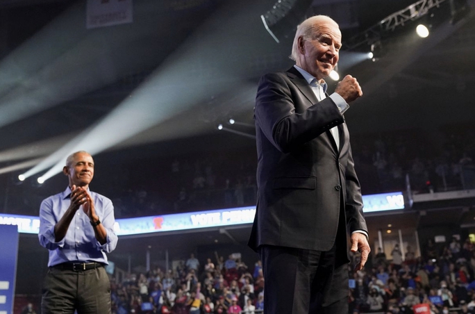 Tổng thống Joe Biden và cựu Tổng thống Barack Obama vận động cho ứng viên Thượng viện John Fetterman và ứng viên Thống đốc bang Pennsylvania Josh Shapiro ở bang Pennsylvania ngày 5-11. Ảnh: Reuters