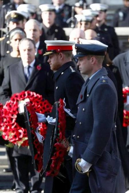 Harry cùng các thành viên Hoàng gia Anh đặt ṿng hoa ở Đài tưởng niệm Cenotaph năm 2019. Ảnh: SWNS