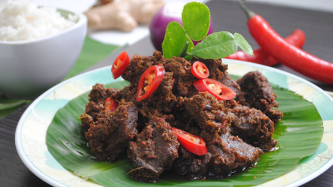 Đây là món ăn được yêu thích có nguồn gốc từ tây Sumatra, và ngày nay phổ biến tại nhiều nước như Malaysia, Brunei, Philippines. Bò rendang hay cà ri bò khô được tẩm ướp từ lá chanh kaffir, nước cốt dừa, hoa hồi, ớt đỏ cùng nhiều loại gia vị địa phương. Món ăn thường dùng để mời khách, và không thể thiêu trong các sự kiện, lễ hội. Ảnh: Taste of Asian Food