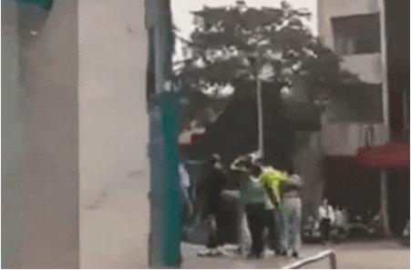 Chứng kiến cô gái bị đạp bay từ bậc thềm xuống vỉa hè, một số người dân đã chạy tới căn ngăn. Trong đó, có một người đàn ông mặc áo sơ mi trắng lao đến đánh tới tấp thanh niên mặc đồ đen-xám vì người này liên tục đá vào bụng cô gái.