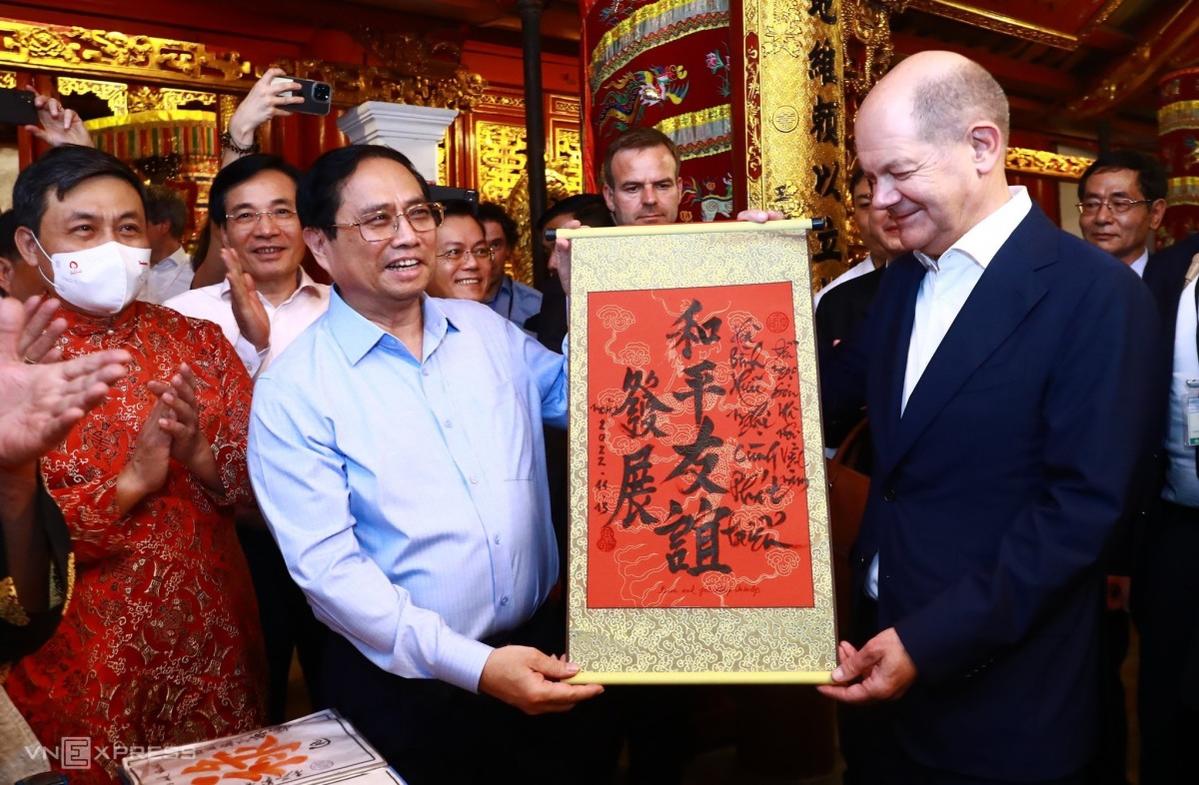 Thủ tướng Phạm Minh Chính chuyển bức thư pháp ông đồ tặng cho Thủ tướng Scholz với dòng chữ "Hoà bình hữu nghị cùng phát triển - Đền Ngọc Sơn Hà Nội Việt Nam".