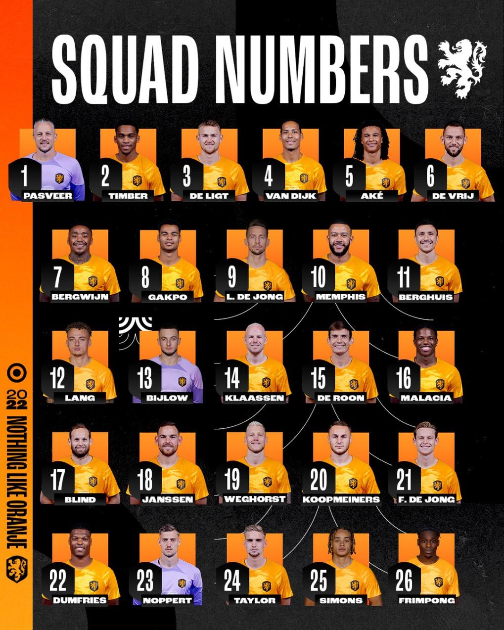 Frenkie de Jong và Teun Koopmeiner - hai tiền vệ được nhận định sẽ đá chính trận mở màn gặp Senegal ngày 21/11 - lần lượt mang áo số 21 và 20. Trung phong Luuk de Jong mặc áo số 9, Memphis Depay được trao chiếc áo số 10, còn đội trưởng Virgil van Dijk mang số áo số 4 quen thuộc.