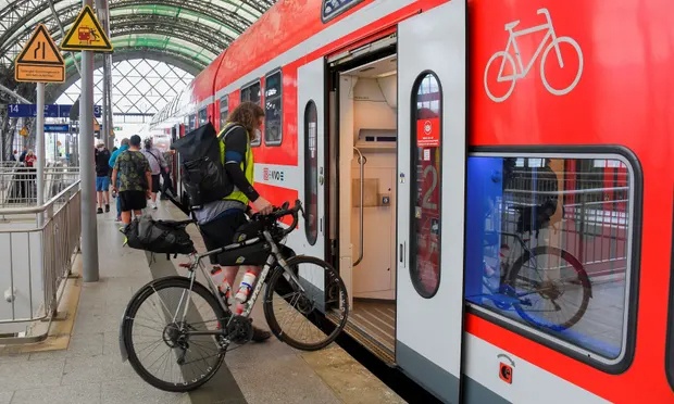 Một người đi xe đạp lên tàu ở Dresden, Đức. Vé tháng 9 euro từ tháng 6 đến tháng 8 đă thúc đẩy nhiều người sử dụng phương tiện giao thông công cộng. Ảnh: Reuters.