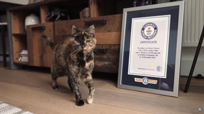 Flossie bên cạnh chứng nhận là con mèo già nhất thế giới của Kỷ lục Guinness. Ảnh: Kỷ lục Guinness Thế giới.