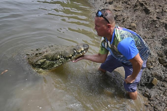 Hướng dẫn viên du lịch Jason Vargas chạm vào một con cá sấu Trung Mỹ trên sông Tarcoles, huyện Tarcoles, tỉnh Puntarenas, Costa Rica ngày 31/3. Ảnh: AFP.