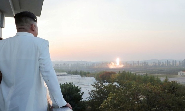 Ông Kim Jong-un giám sát một vụ phóng tên lửa tại một địa điểm không được tiết lộ ở Triều Tiên trong bức ảnh do KCNA công bố ngày 9/10. Ảnh: KCNA.
