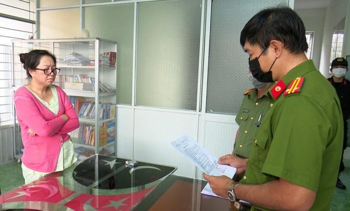 "Bà trùm" Mười Tường tại thời điểm nghe công an đọc lệnh khởi tố. (Ảnh: Phạm Giang - Nghiêm Túc)