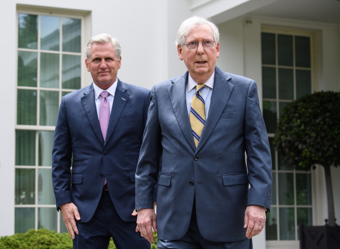Lãnh đạo Cộng hòa tại Thượng viện Mitch McConnell (phải) và lãnh đạo Cộng hòa tại Hạ viện Kevin McCarthy họp báo tại Nhà Trắng ngày 12/5/2021. Ảnh: AFP.