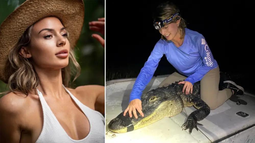 Rosie Moore khi làm người mẫu (trái) và khi bắt cá sấu hồi tháng 1/2021 ở Florida. Ảnh: Instagram/Rosie Mooore