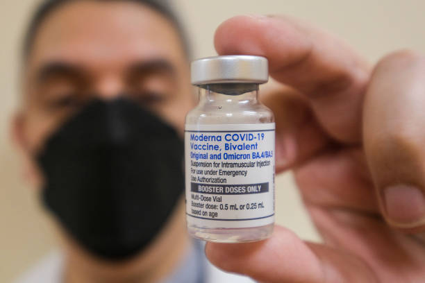 Một dược sĩ đang cầm một lọ thuốc ngừa Covid-19 Bivalent của Moderna tại phòng y tế AltaMed Medical ở Los Angeles ngày 6 tháng 10, 2022. (Photo by RINGO CHIU / AFP) (Photo by RINGO CHIU/AFP via Getty Images)