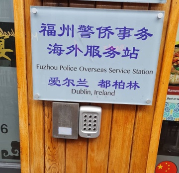 Một "trạm phục vụ hải ngoại" của cảnh sát thành phố Phúc Châu (Phúc Kiến) tại thủ đô Dublin, Ireland. Tấm biển này đã được gỡ bỏ khoảng hai tháng trước. Ảnh: Irish Times.