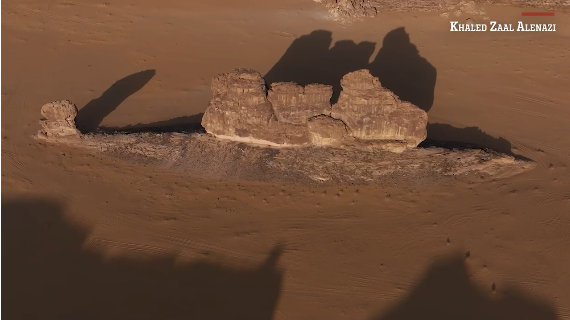 Trong cảnh quay bằng máy bay không người lái được ông Al Enazi ghi lại vào tháng 6 năm nay, khối đá hình thành giống như một sinh vật dưới nước đang bơi qua bãi cát vàng, cấu trúc phần nổi lên trông giống như vây lưng của nó, đồng thời giúp người xem liên tưởng đến một con cá mập trồi lên từ nước biển sâu để rình mồi.