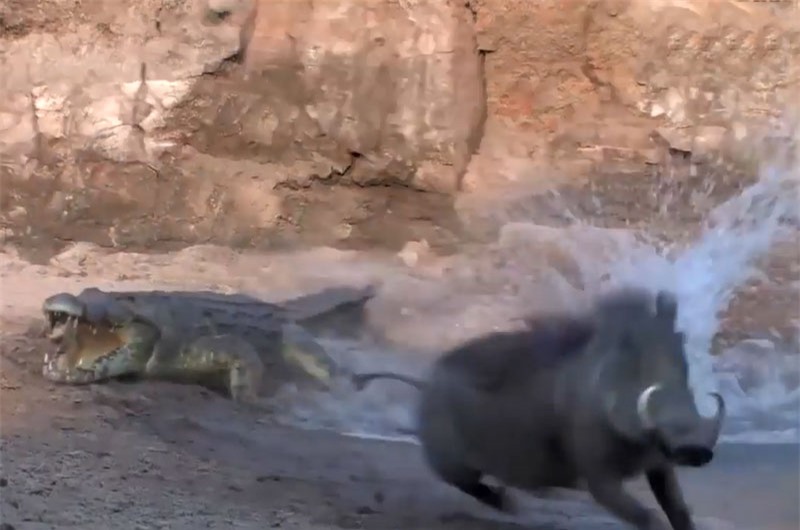 Lợn rừng và hươu thoát chết trong gang tấc trước hàm cá sấu. Mặc dù con cá sấu đã có kế hoạch săn mồi rất bài bản, nhưng chú lợn rừng và hươu vẫn may mắn tránh được cú đớp “tử thần” của nó.