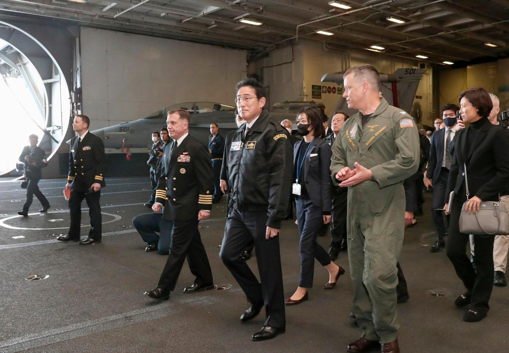 Thủ tướng Fumio Kishida thăm tàu sân bay Mỹ Ronald Reagan. Ảnh: AP.