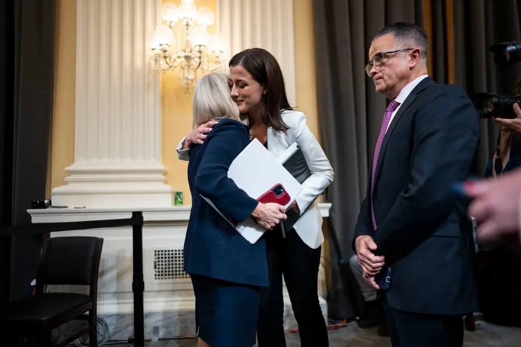 Hạ nghị sĩ Liz Cheney ôm Cassidy Hutchinson sau lời khai của cô trước ủy ban vào ngày 28/6. Ảnh: New York Times.