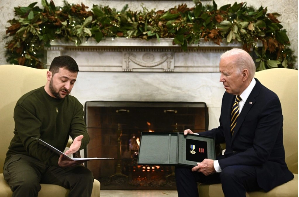 Trong cuộc gặp Tổng thống Joe Biden tại Nhà Trắng hôm 21/12, Tổng thống Zelensky đã gửi tặng Tổng thống Biden một huy chương quân sự như một món quà nhân chuyến thăm của nhà lãnh đạo Ukraine tới Mỹ. Đây là chuyến công du nước ngoài đầu tiên của ông Zelensky kể từ khi xung đột Nga - Ukraine nổ ra hồi cuối tháng 2 năm nay.