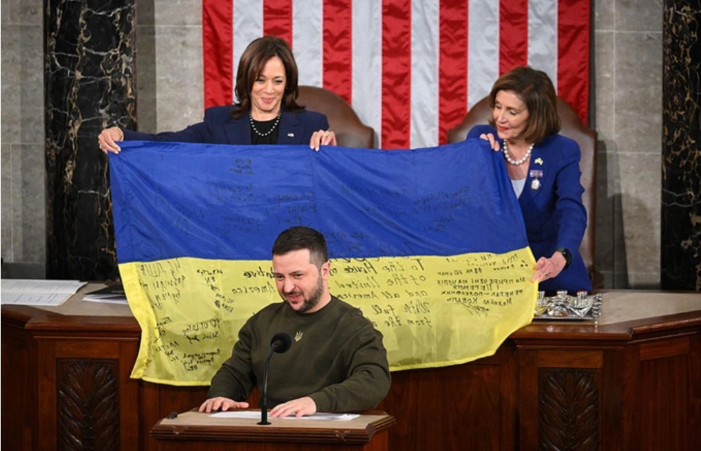 Tổng thống Zelensky đã tặng Quốc hội Mỹ một lá cờ có chữ ký của các binh sĩ Ukraine như một món quà để bày tỏ sự cảm ơn của Kiev đối với Washington vì đã viện trợ vũ khí.