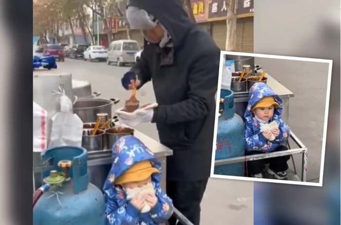 Theo như người bố của bé vẫn đang hăng say làm món bánh mì kẹp thịt Roujiamo – món ăn đường phố truyền thống của Thiểm Tây cho khách hàng, thì chứng kiến cảnh tượng cậu bé con ngồi ăn bánh ngon lành trên xe hàng dong của bố khiến nhiều người vừa sợ hãi vừa xót xa vì thứ bên cạnh.