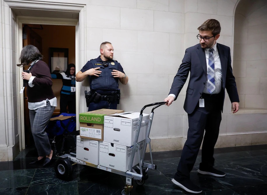 Nhân viên vận chuyển các thùng tài liệu sau khi Tài chính và Thuế vụ Hạ viện Mỹ họp thảo luận về các bản khai thuế của ông Trump. Ảnh: Reuters.
