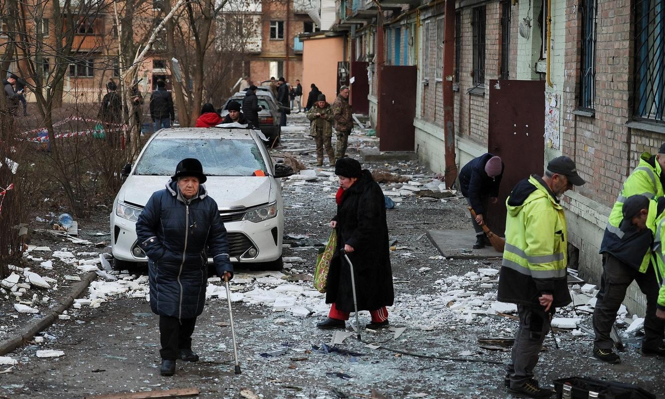 Người dân được sơ tán khỏi một tòa nhà ở Kiev chịu hư hại sau khi trúng tập kích vào ngày 31/12. Ảnh: Reuters.