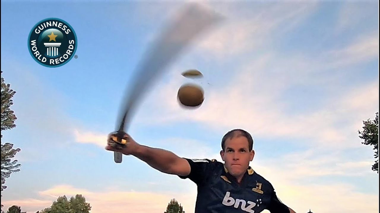 Để thực hiện kỷ lục này, anh đã đứng trên một quả bóng, tay cầm kiếm cắt những quả kiwi mà người bạn đứng cách đó một đoạn, ném về phía anh.