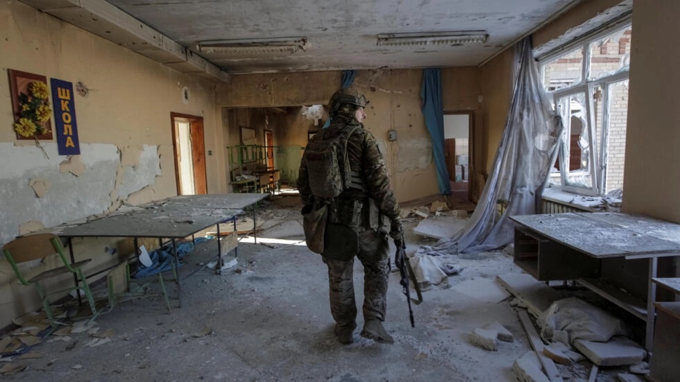 Một người lính Ukraina trong một trường học bị phá hủy ở khu vực gần tiền tuyến, vùng Donetsk. Ảnh chụp ngày Giáng sinh của Chính Thống Giáo, ngày 7/1/2023. REUTERS - STRINGER
