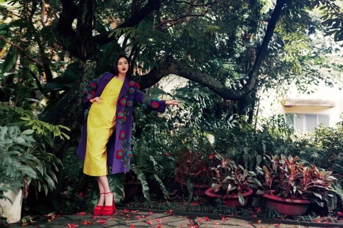 Hoa hậu trong mẫu váy suông, hóa "nàng xuân" giữa khu vườn.