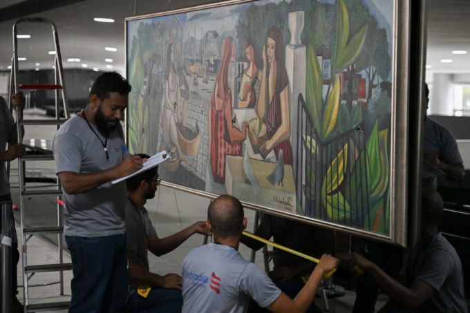 Các chuyên gia giám định thiệt hại bức kiệt tác của danh họa Emiliano Di Cavalcanti, bị đâm 7 nhát trong vụ bạo loạn tại tòa nhà quốc hội Brazil, ngày 9/1. Ảnh: AFP.