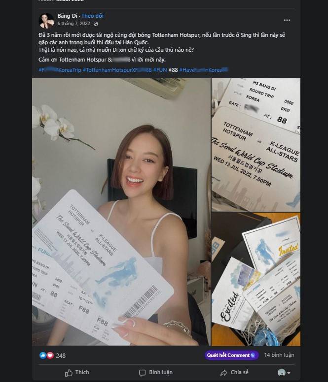 Băng Di khoe được nền tảng F**88 mời đi Hàn Quốc xem thi đấu. Ảnh: Băng Di.