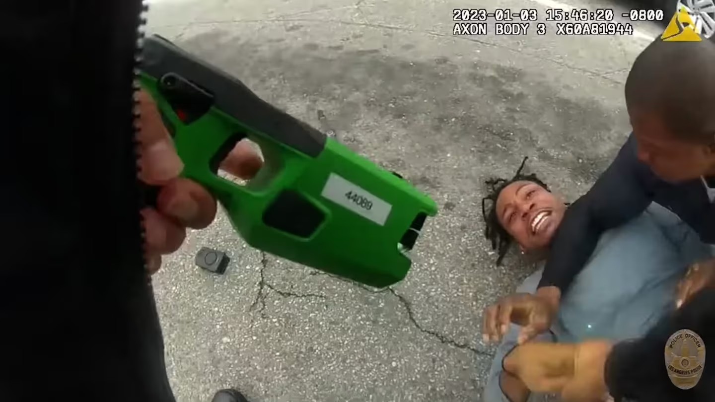 Một sĩ quan dùng khuỷu tay đè lên cổ ông Anderson nằm xuống, trong khi một sĩ quan khác liên tục dùng súng điện bắn vào cơ thể ông. Ảnh: Cắt từ video hiện trường.