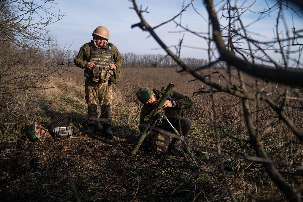 Binh sĩ Ukraine điều chỉnh một bệ phóng súng cối dọc chiến tuyến ở khu vực Donetsk. Ảnh AFP