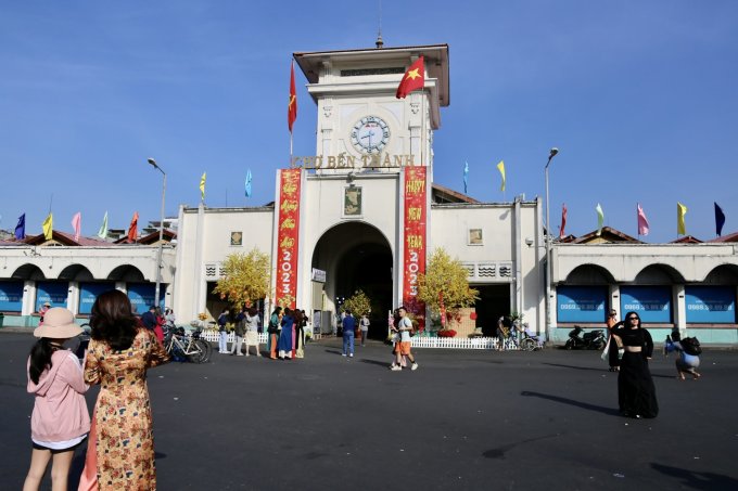 Nhiều người tạo dáng, chụp ảnh trước chợ Bến Thành, cuối đường Lê Lợi sau khi Metro số 1 hoàn trả mặt bằng và giao thông khu vực được tổ chức lại, sáng 30 Tết. Ảnh: Đình Văn