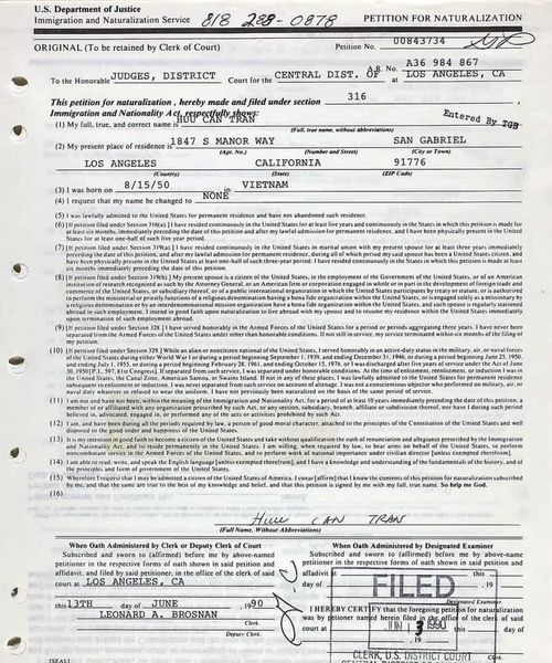 Giấy tờ nhập tịch Hoa Kỳ của ông Trần Hữu Cần cho thấy ông ấy sinh ngày 15 tháng 8, 1950 ở Việt Nam. Dựa theo hồ sơ ly dị thì người vợ cũ của không khai là ông Trần Hữu Cần di dân từ Trung Quốc sang Hoa Kỳ. Ông nhập tịch Hoa Kỳ vào năm 1990.
