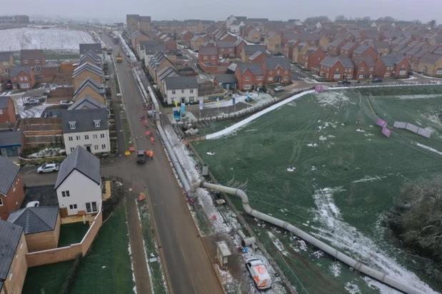 Hình ảnh chụp từ trên cao cho thấy quy mô khổng lồ của đường ống cống hình con rắn này. Nó chỉ cách cửa nhà dân vài mét và nằm trong khu dân cư Wendelburie Rise, do Công ty nhà đất Bovis Homes xây dựng ở Northamptonshire.